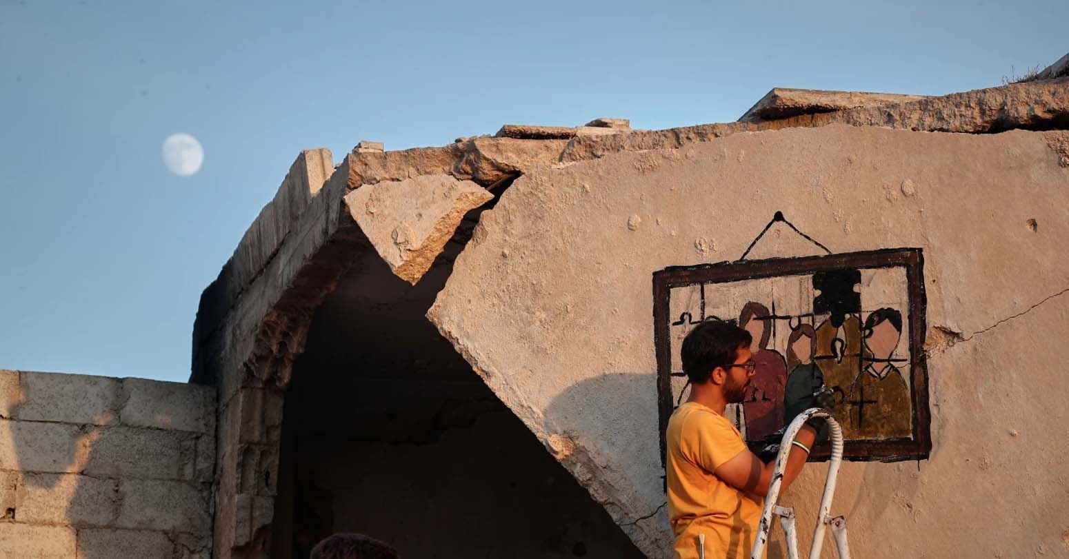 In the war-ravaged town of Daraya, on the outskirts of Damascus, a group of young Syrian artists has turned the ruins of a bombed-out house into a canvas of remembrance. On the collapsed ceiling, they painted a colorful graffiti mural honoring families lost during years of conflict.
