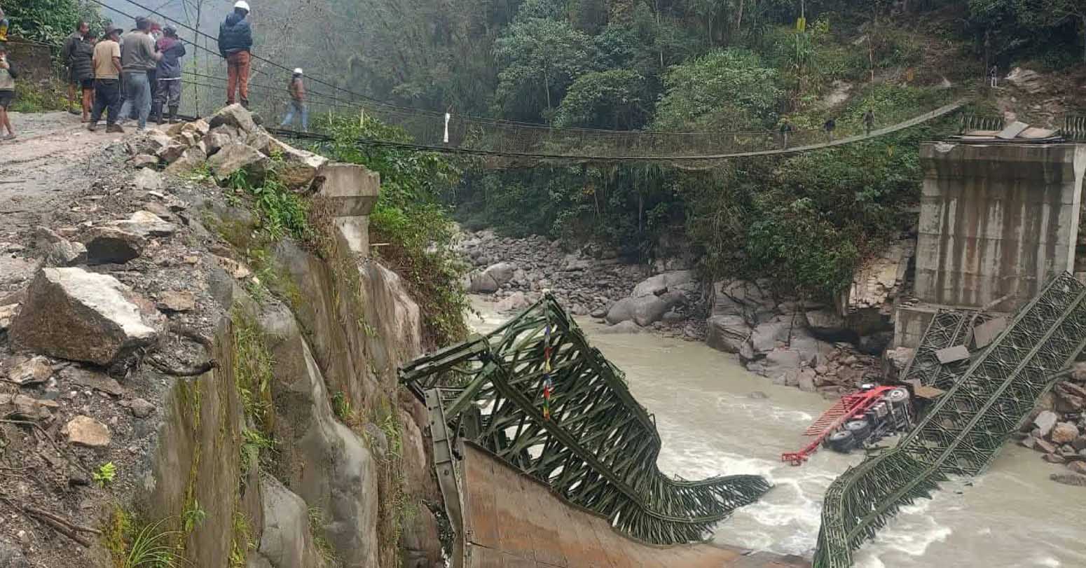 Deputy Superintendent of Police at the District Police Office, Sankhuwasabha, Kumar Prasad Mainali, said that the bailey bridge broke down at 9:00 this morning while a truck loaded with cement was passing through it. As a result, the truck (Province-03-001 Ka 2920) fell into the Arun River.